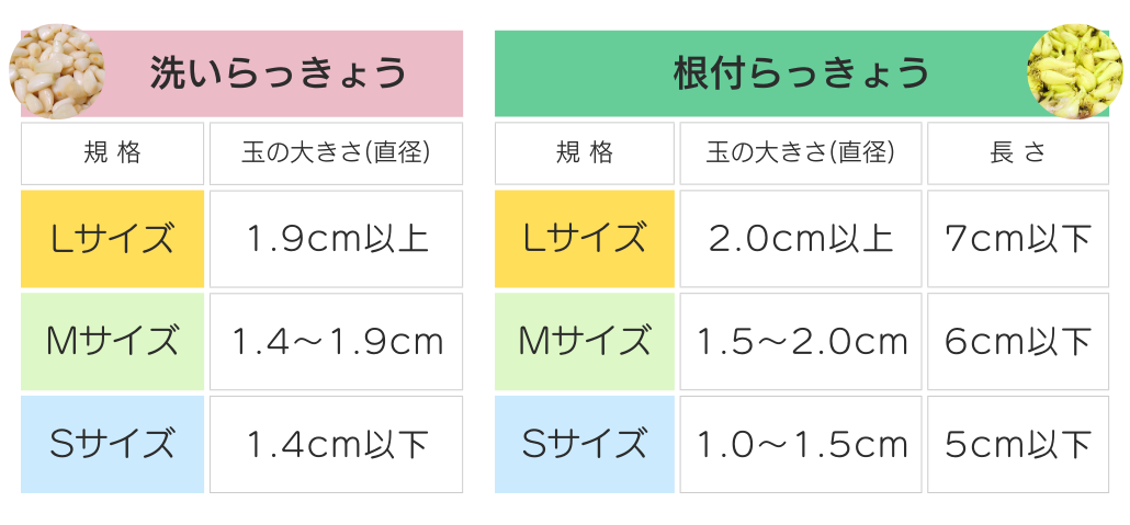 「洗いらっきょう」と「根付らっきょう」の2種類を取り揃えました。