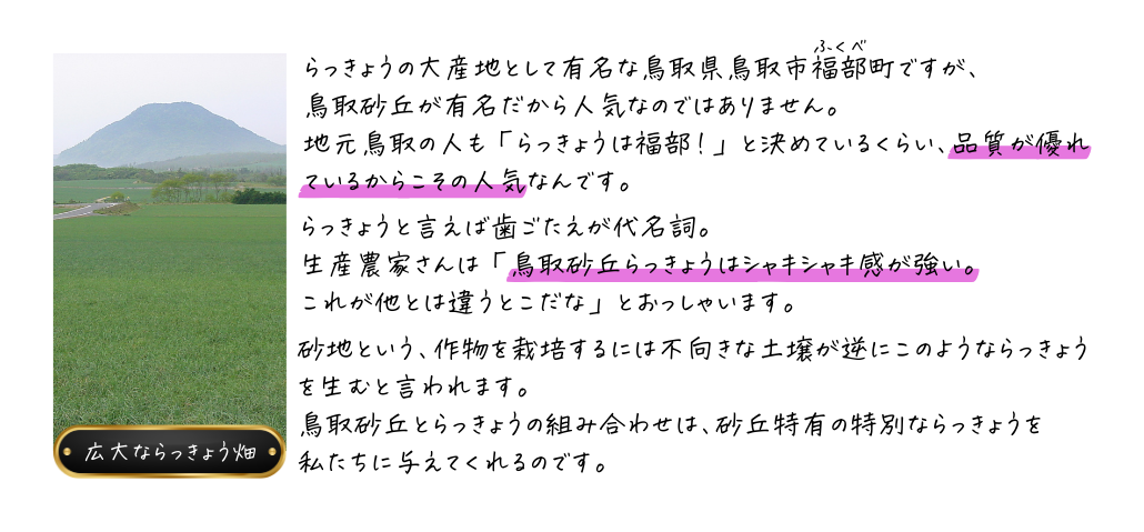 | 名 称 | 鳥取砂丘らっきょう 根付らっきょう |